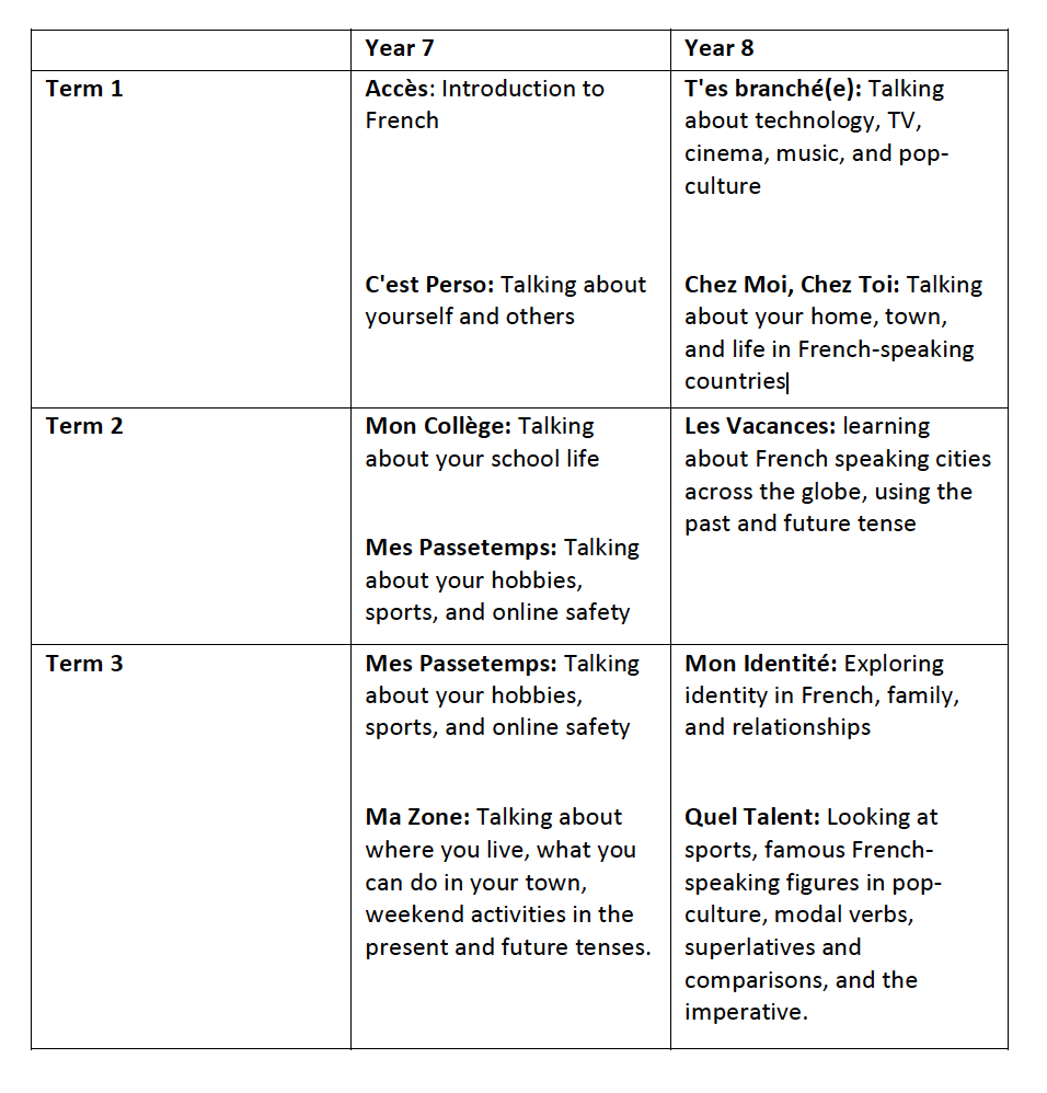 Year 7 | The Basics: Phonics, Greetings, Introducing yourself | Inter-Personal Relationships: Friends, Family, What makes a good friend? | Mon Collège: Talking about your school | Mes Passe-Temps: Hobbies, Sports, and Interests | Mes Passe-Temps: Hobbies, Sports, and Interests | Où J'habite: Describing a town and where you live | |