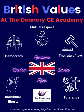 The promotion of these values in schools is part of the government's efforts to create a more cohesive and integrated society, as well as as a way to protect children from extremist ideologies. Students at The Deanery CE Academy encounter all of these British values throughout their curriculum, but they are mostly explicitly taught in subjects such as : RE, History, Geography and ViP (PSHE), as well as during tutor time learning.